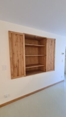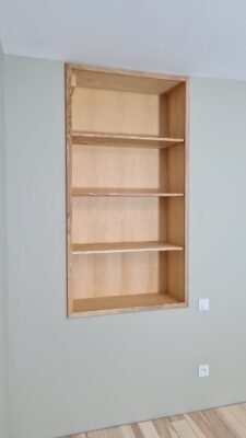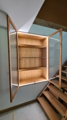 Caisson en contre-plaqué de chêne avec les portes et étagères en chêne massif. Les portes sont en verre sécurit avec une ouverture en push to open. Un ruban de led vient illuminer l’ensemble de la niche afin de mettre en valeur chaque objet.