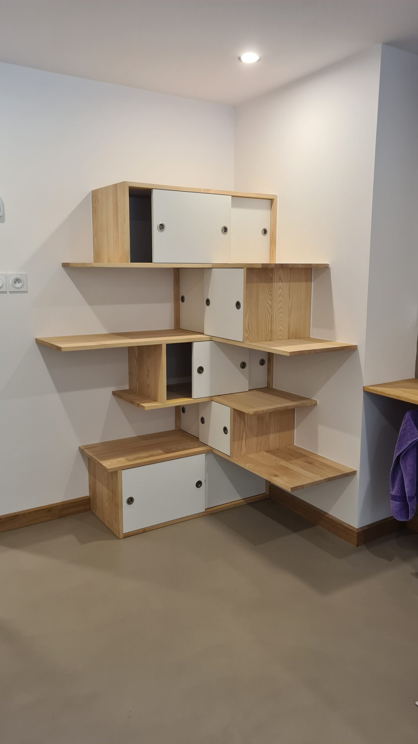 Meuble d’angle en frêne massif et façade en mélaminé blanc. Ce mixte allège visuellement cet aménagement à l’allure décalée. Il permet autant des espaces de rangements dissimulés que des parties étagères.