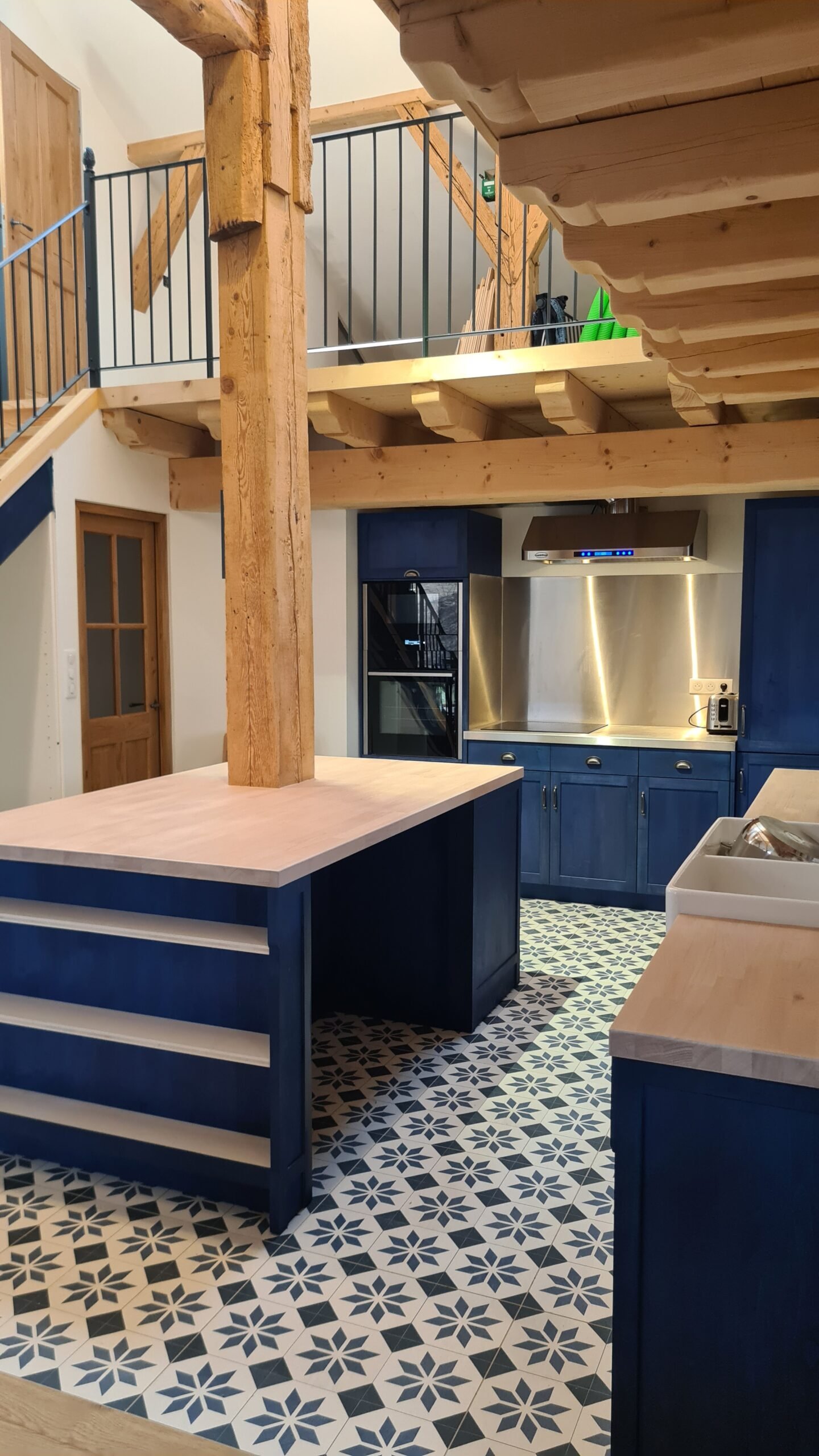 Cuisine en érable teintée bleu avec îlot central. Les cadres et moulures donnent un aspect légèrement rustique, mais qui s’accordent parfaitement au style de la maison. Les façades donnent lieu à des tiroirs dit à « l’Anglaise » pour un choix ergonomiques.