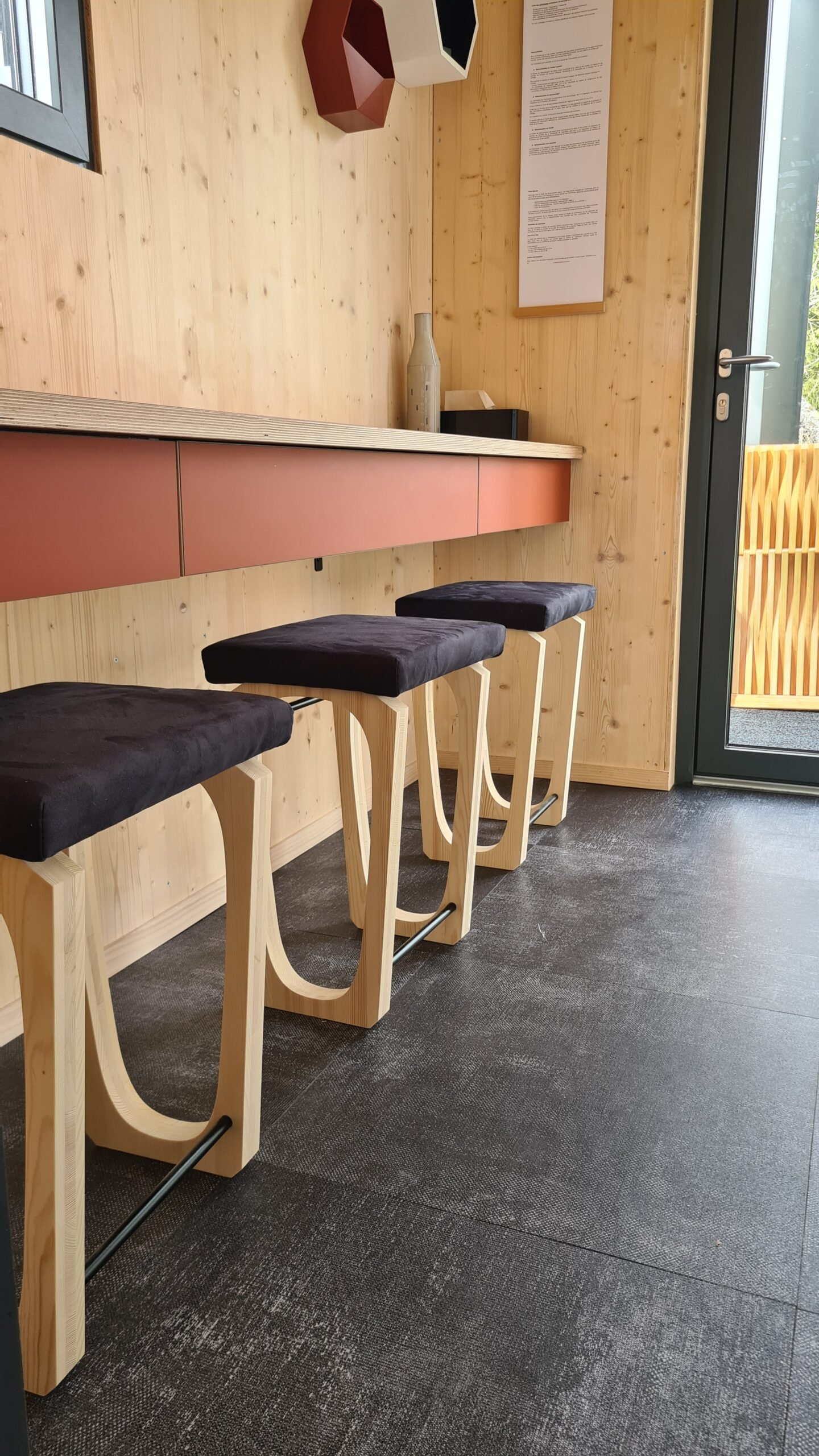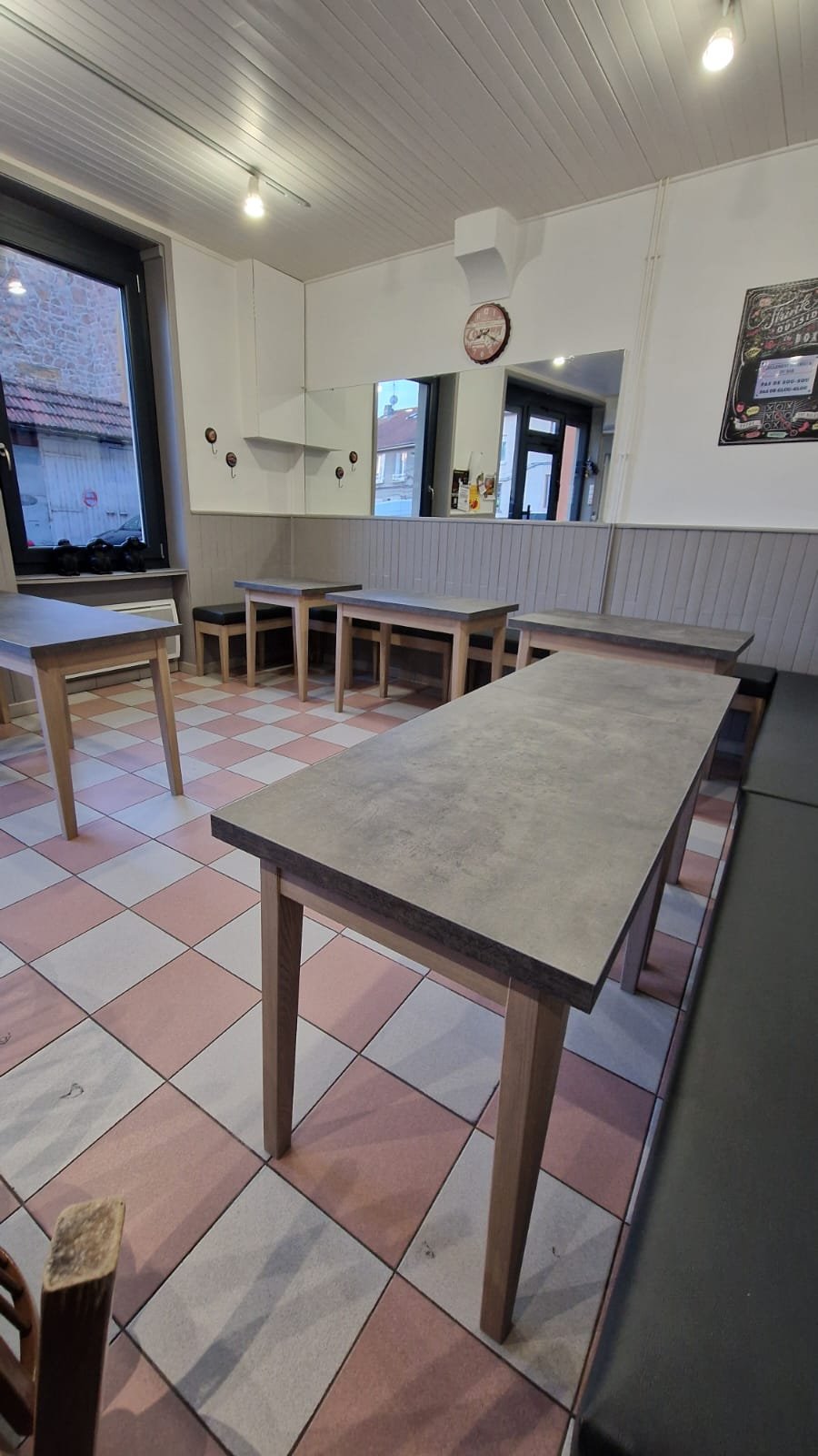 Mobilier de bar réalisé en frêne massif, avec un plateau en stratifié effet pierre. Les tables et banquettes ont été dessinées dans un esprit cohérent afin de créer un ensemble harmonieux. Les piètements, gainés et chanfreinés en biais, allient confort d’utilisation et élégance visuelle. Une mousse épaisse, habillée de simili cuir gris anthracite, vient compléter l’assise des banquettes fabriquées sur mesure dans mon atelier.