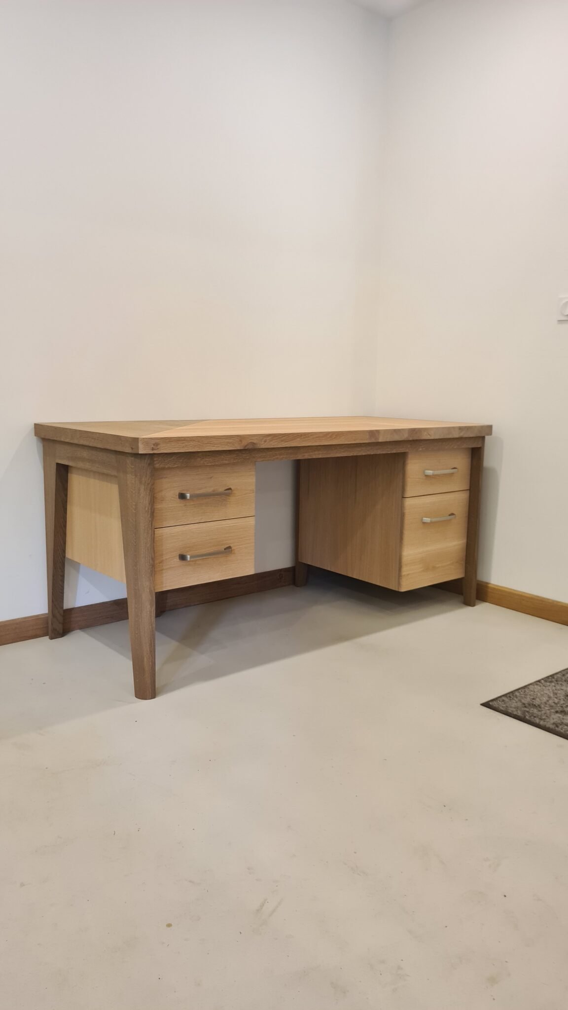 Bureau en chêne massif au design affirmé, il se distingue par son plateau en Z inversé qui lui apporte finesse et légèreté. L’association entre le bois naturel et les éléments teintés en gris chaleureux crée un contraste élégant. Ce jeu de matières et de formes donne naissance à un meuble de caractère, parfaitement en harmonie avec l’esthétique de la maison.